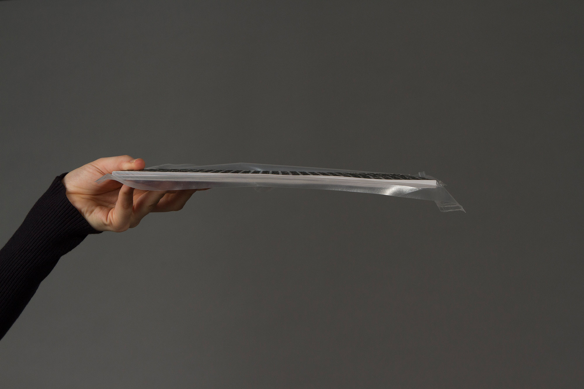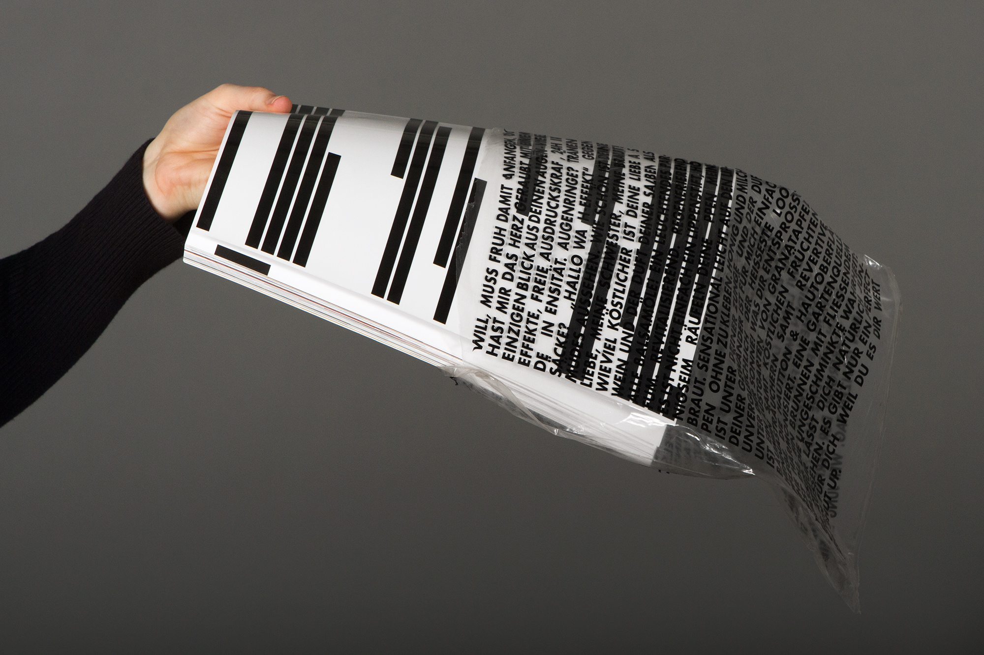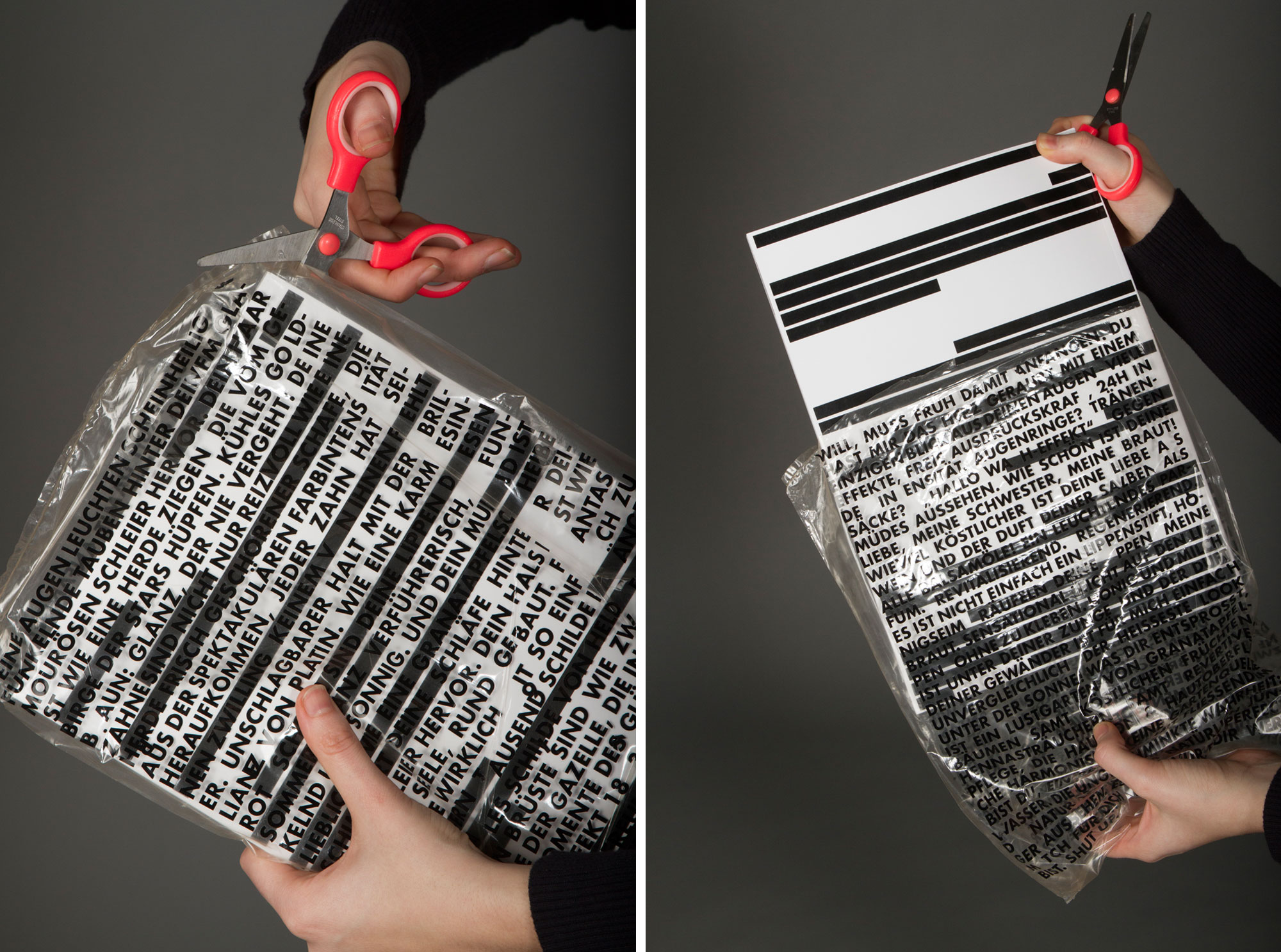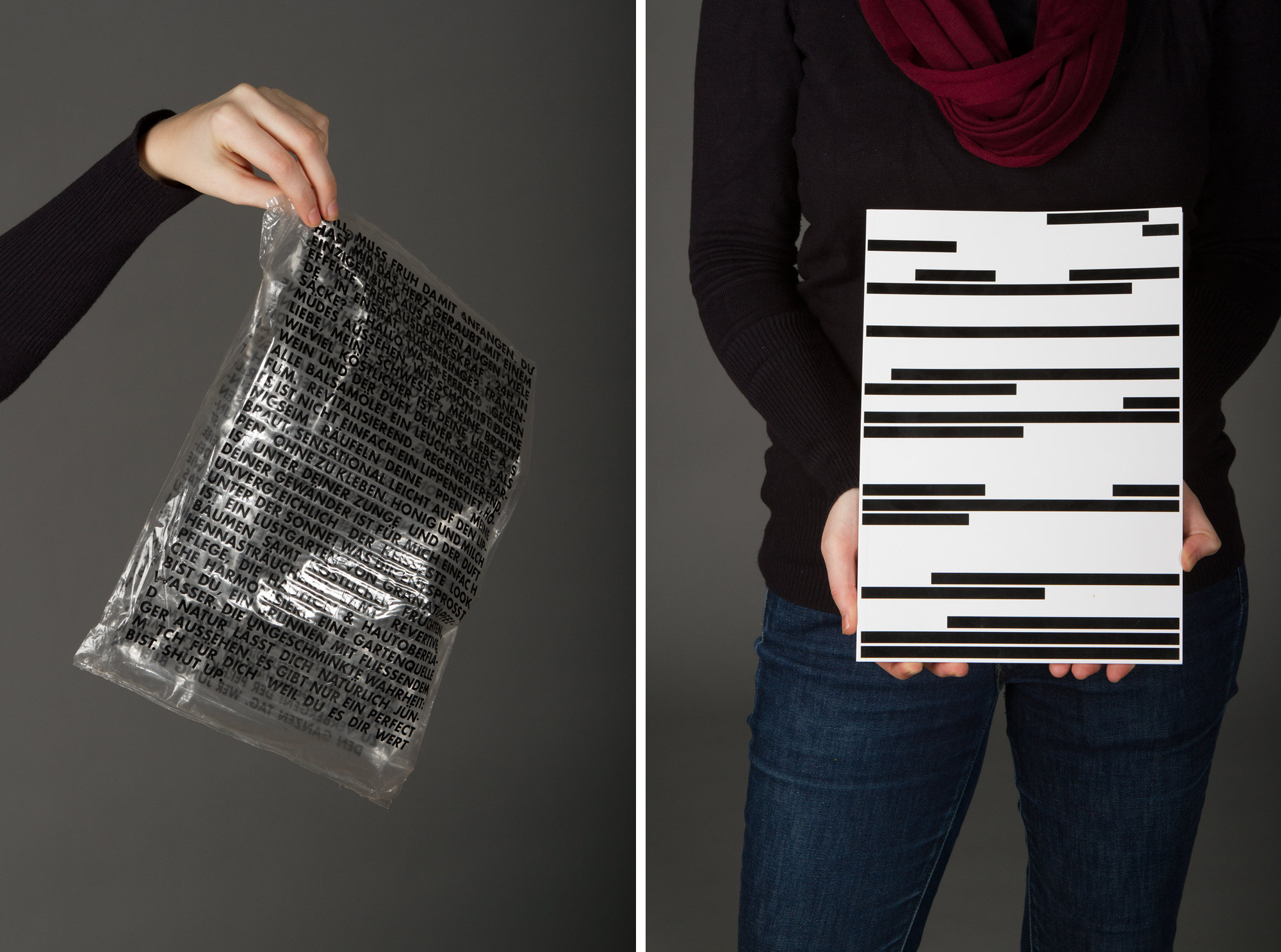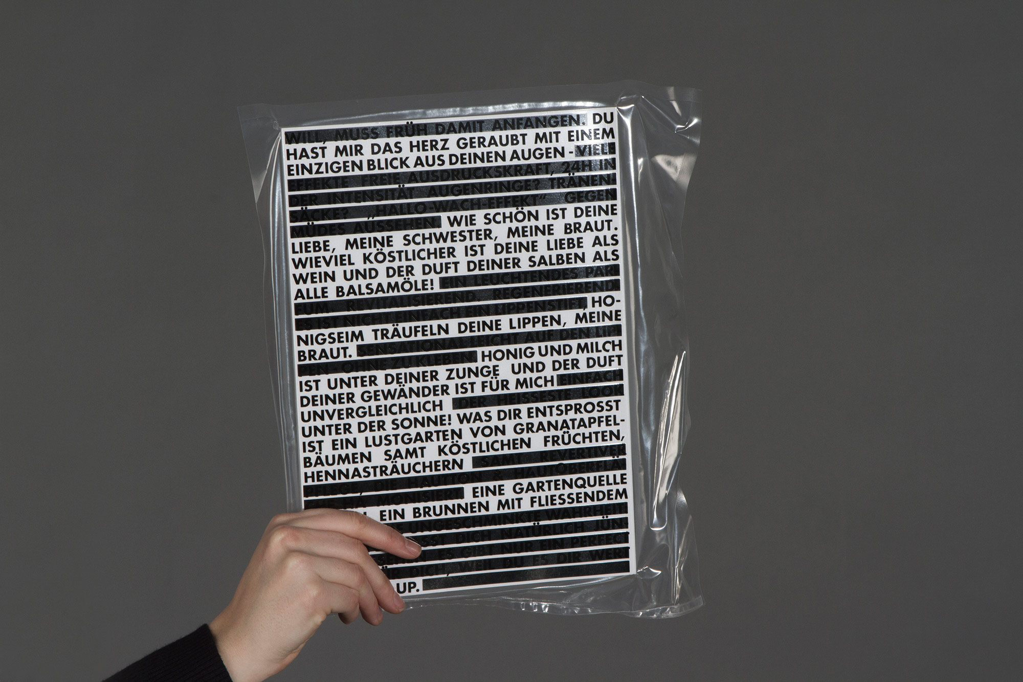 The Song of Solomon from the bible is printed on the outside: „… Your lips are like a scarlet thread, and your mouth is lovely. Your cheeks are like halves of a pomegranate behind your veil. …“ The black lines censor advertising claims, which cannot or hardly be read e.g: „You are my perfect match“. If you open the packaging the magazine becomes soft again. The black lines are printed on the magazine cover and its back. The whole text on the foil is mingled now: the song of Solomon and the advertising claims become one text, they can‘t be distinguished anymore.