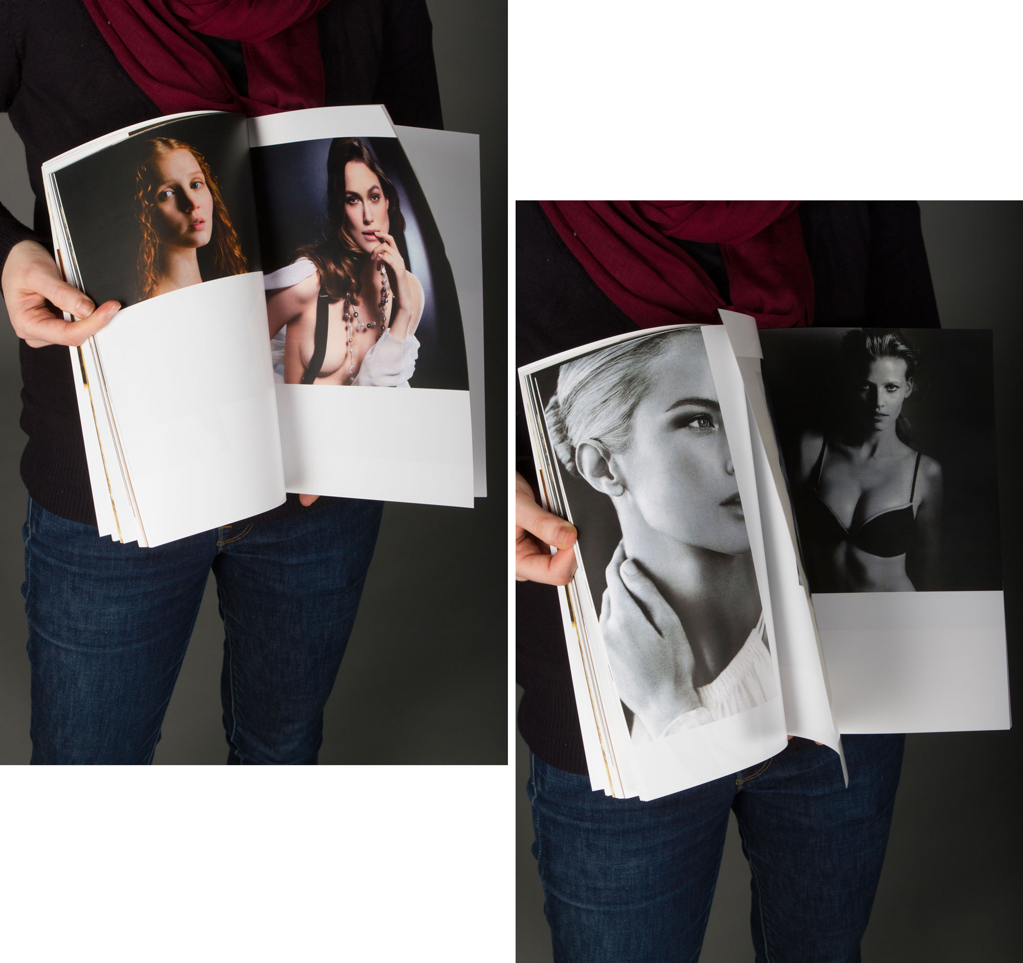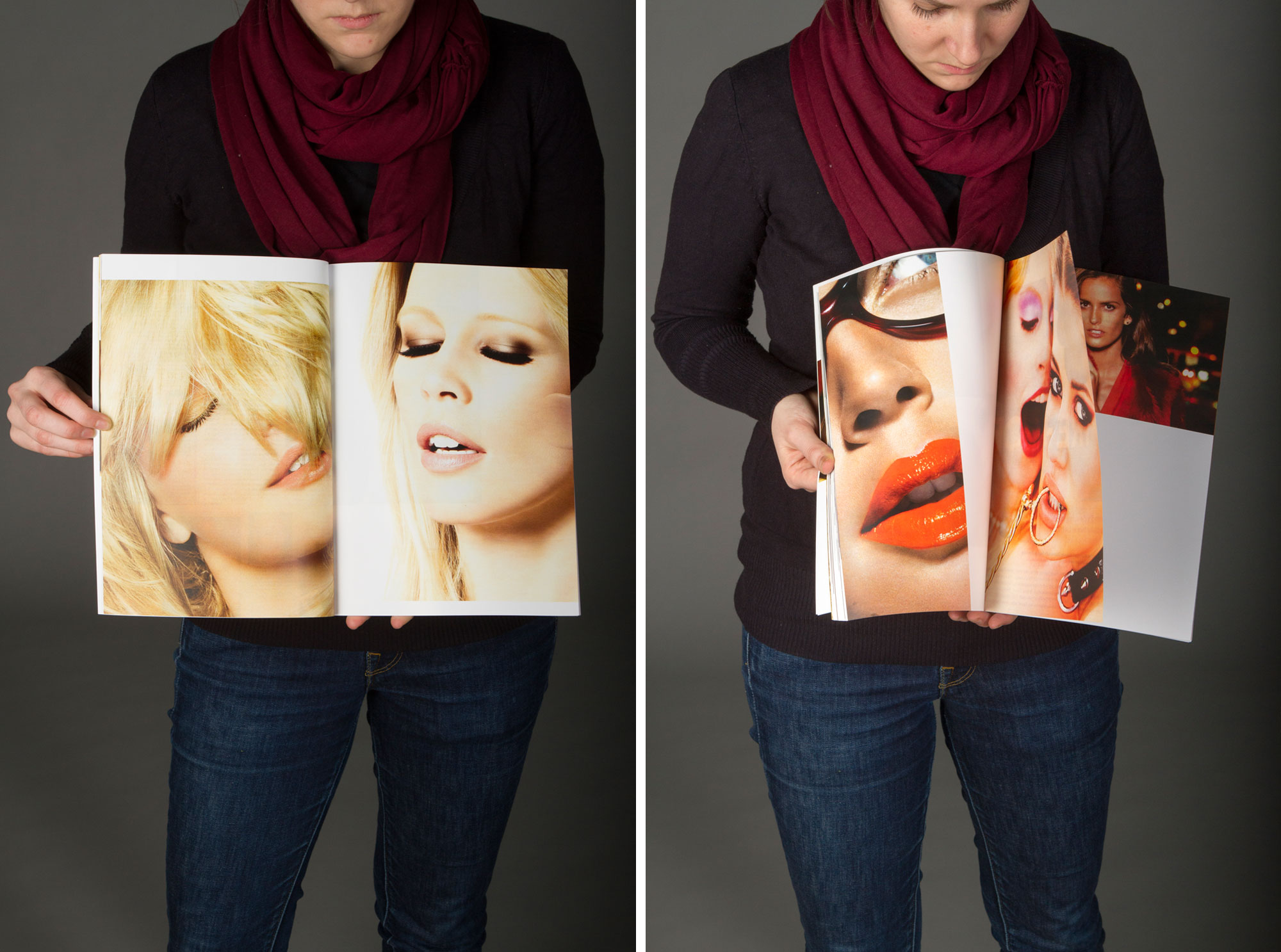 The actual content of the magazine are beautiful, female, photoshopped women having their mouth lasciviously opened. They were taken from advertisings printed in German magazines. The women were advertising any kind of products from perfume, insurances to herbal tea. A German publishing house sent us a box of all magazine issues they published in the past 3 months. We selected and scanned all women with opened mouths - from slightly to widely opened - and arranged them on 160 pages. All the advertised products are covered and censored with white space. Some of their claims are printed on the outside foil. No text is inside the magazine only the female presenters are left without their message.