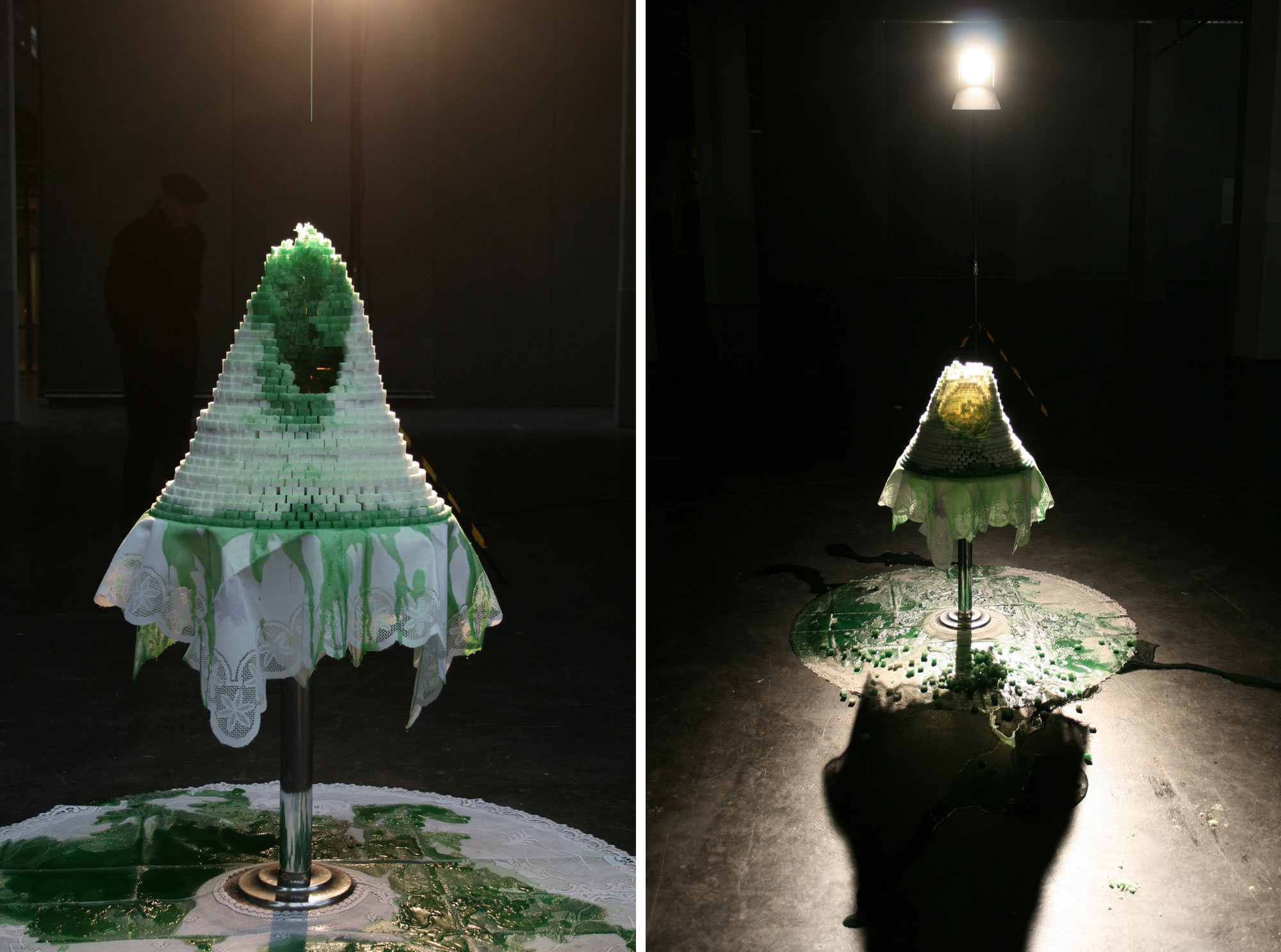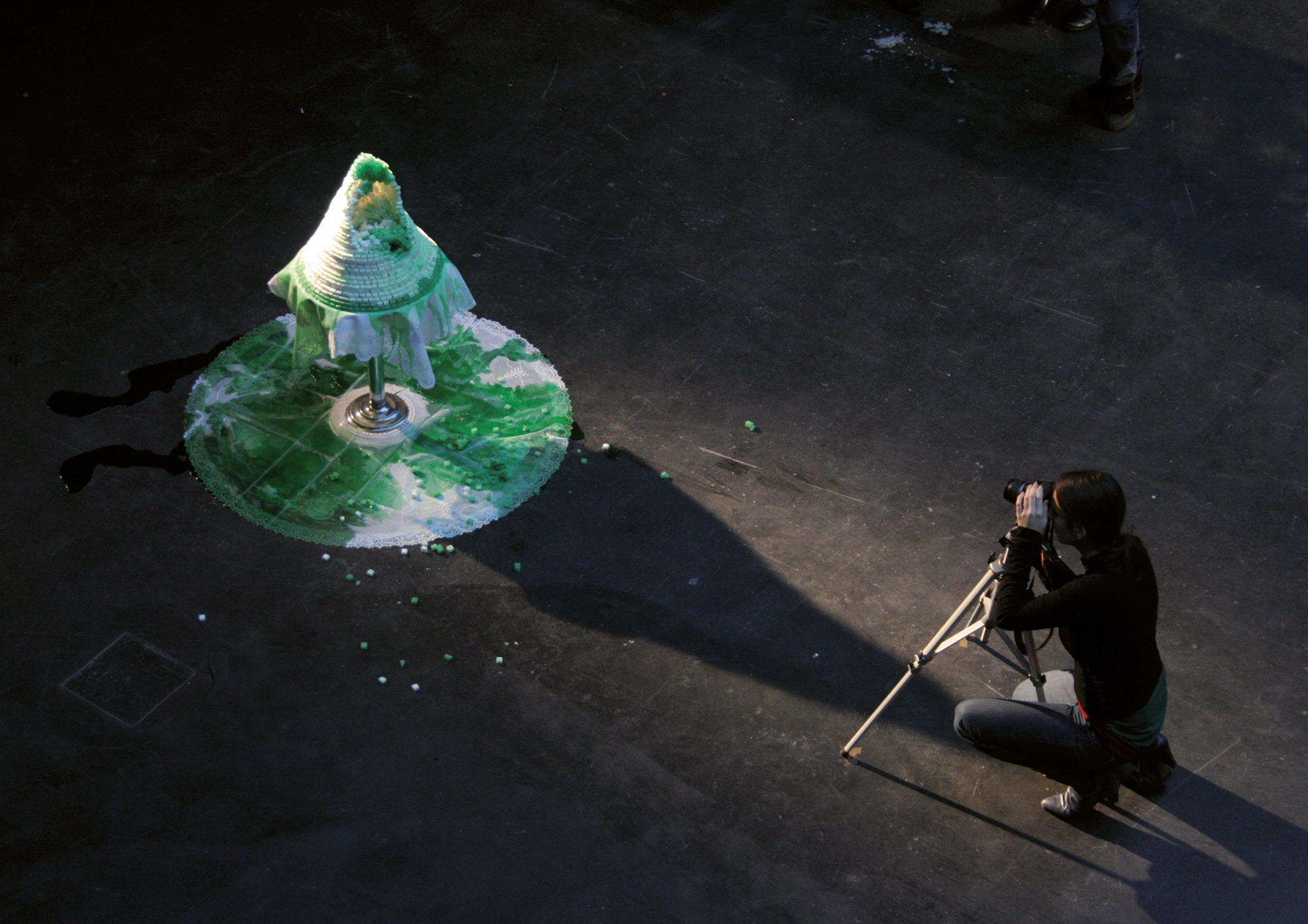 Every year the christmas tree exhibition is taking place for a week at the university of arts and design Karlsruhe. The sugar tree was made of lump sugar piled up as a white, glittering tree. A drip filled with liquid green food color was installed invisibly 10 meters above the tree. Small drops of green color were dripping over a period of 7 days and slow by slow destroyed the sugar tree. The greener the tree became the more the sugar dissolved and melted away.