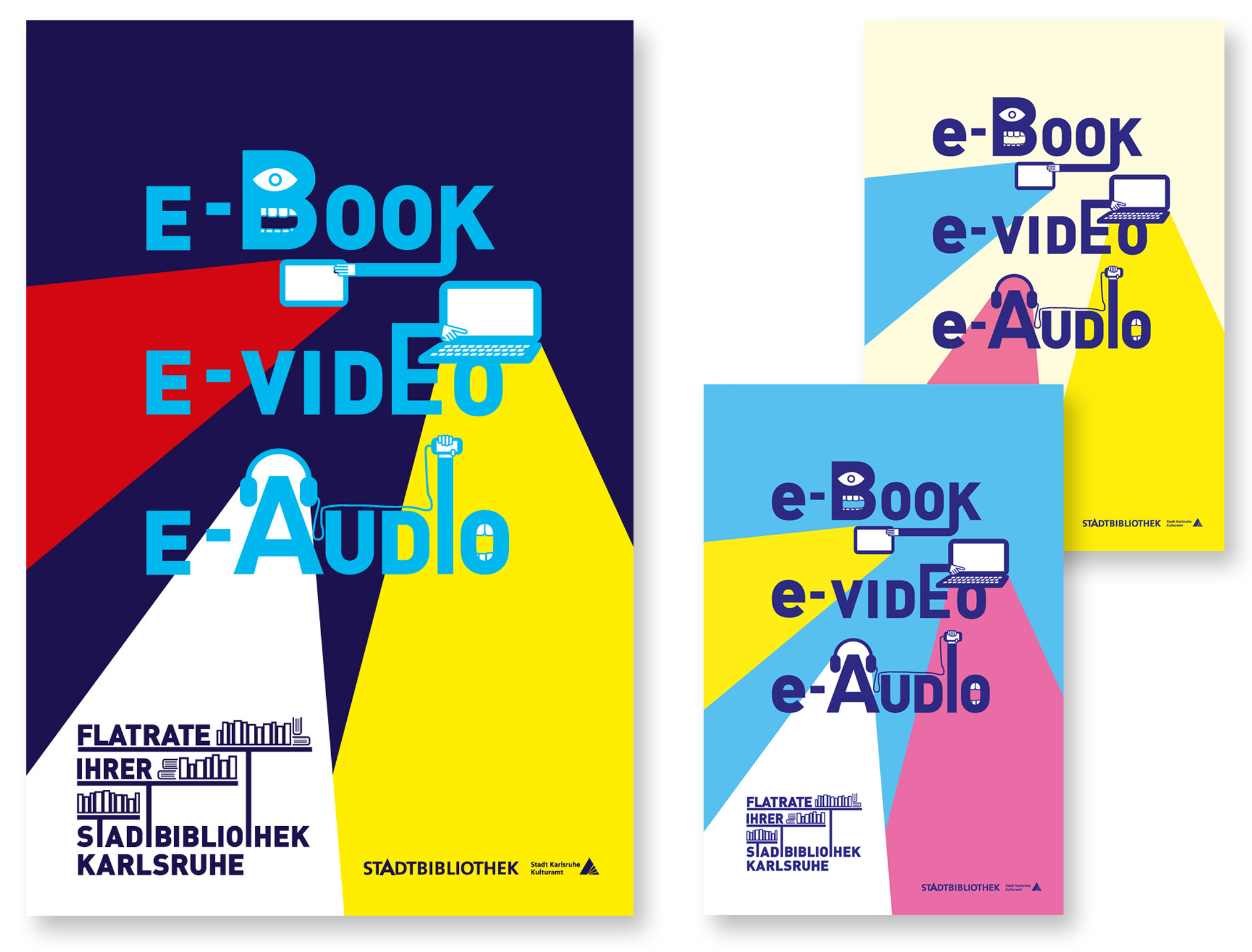 For many years I am designing several print products for the „Stadttbibliothek Karlsruhe“ (public library of Karlsruhe). I use a simple typeface modified with illlustrations which can be used for posters like the e-book poster, flyer, christmas card and signage.